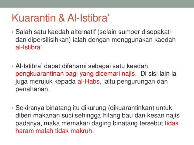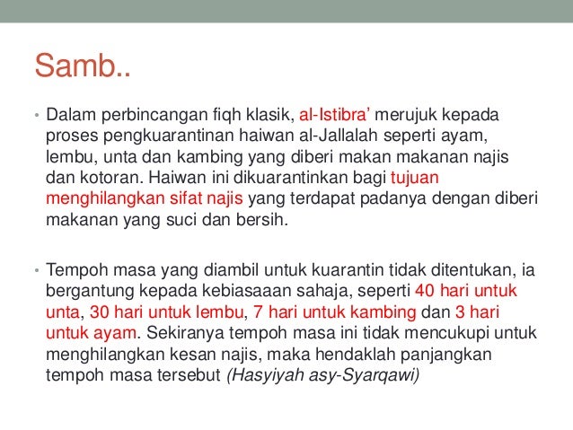 Dalam perbincangan fiqh klasik al-Istibra merujuk kepada proses pengkuarantinan haiwan al-Jallalah seperti ayam lembu unta dan kambing yang diberi makan makanan najis dan kotoran. Awan kelam berarak menjauh ke arah timur angin diam tak berhembus laut tenang tak bergelombang binatang jadi terhenyak telinga yang bernyawa semua menyimak dan syaitan pun terlempar kutuk. 1 PENDAHULUAN 01 PENGENALAN Kajian ilmiah ini bertajuk ANALISIS HADITH MENGENAI HAIWAN FASIQ DALAM AL-KUTUB AL-SITTAH.