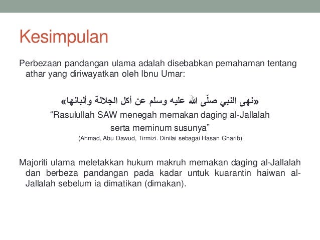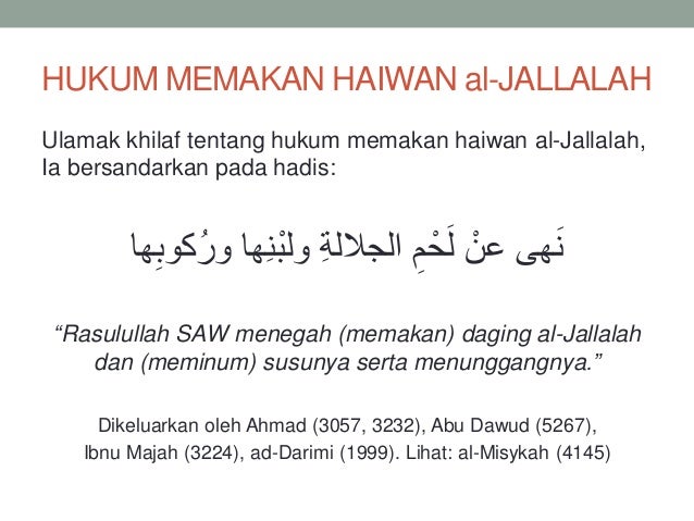 Hukum memakan daging haiwan berkenaan adalah makruh sejajar sabda Nabi SAW. 10 Haiwan al-Jallalah yang berstatus haram atau makruh perlu dikuarantinkan dalam tempoh tertentu untuk tujuan penyucian haiwan tersebut kepada halal. إذا ترك العبد الدعاء للوالدين فإنه ينقطع الرزق - رواه الديلمى - تحذيب أطراف الحديث ص 24.