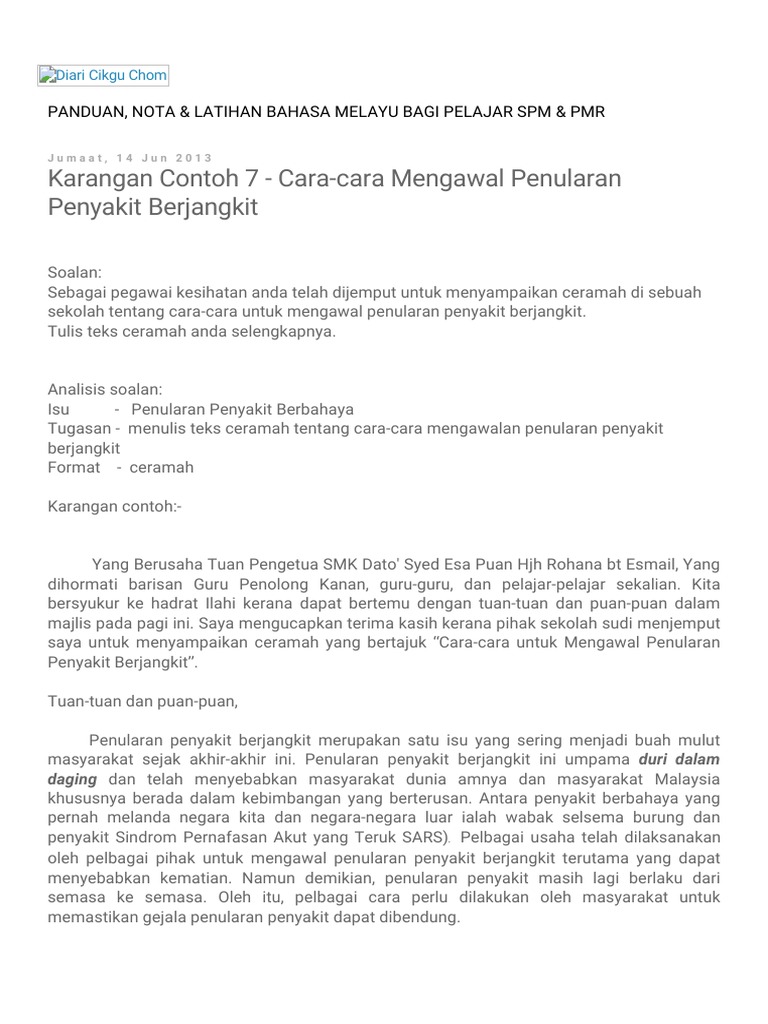 Berdirinya saya di sini adalah untuk menyampaikan sebuah ceramah yang bertajuk Kepentingan Amalan Nilai-nilai. KARANGAN SPM - CERAMAH - CARA-CARA MENANGANI PENYAKIT BERJANGKIT TAJUK ULBS Sebagai pegawai kesihatan anda telah dijemput untuk menyampaikan ceramah di sebuah sekolah tentang cara-cara untuk mengawal penularan penyakit berjangkit. Pastu ianya juga dapat meningkatkan kesegaran tubuh badan dan menurunkan kolestrol dengan cara kita suka bersenam dan bawa haiwan.