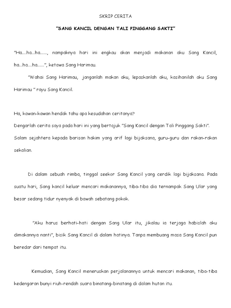 BMMB3083 DRAMA DALAM PENDIDIKAN CONTOH SKRIP DRAMA KANAK-KANAK KISAH KANCIL DAN KAWAN-KAWANNYA Watak-Watak. Cerita Fabel Berikut ini adalah cerita fabel yang merupakan cerita hewan yang diperankan bertingkah laku seperti manusia. Airnya cetek saja jernihdan sejuk.